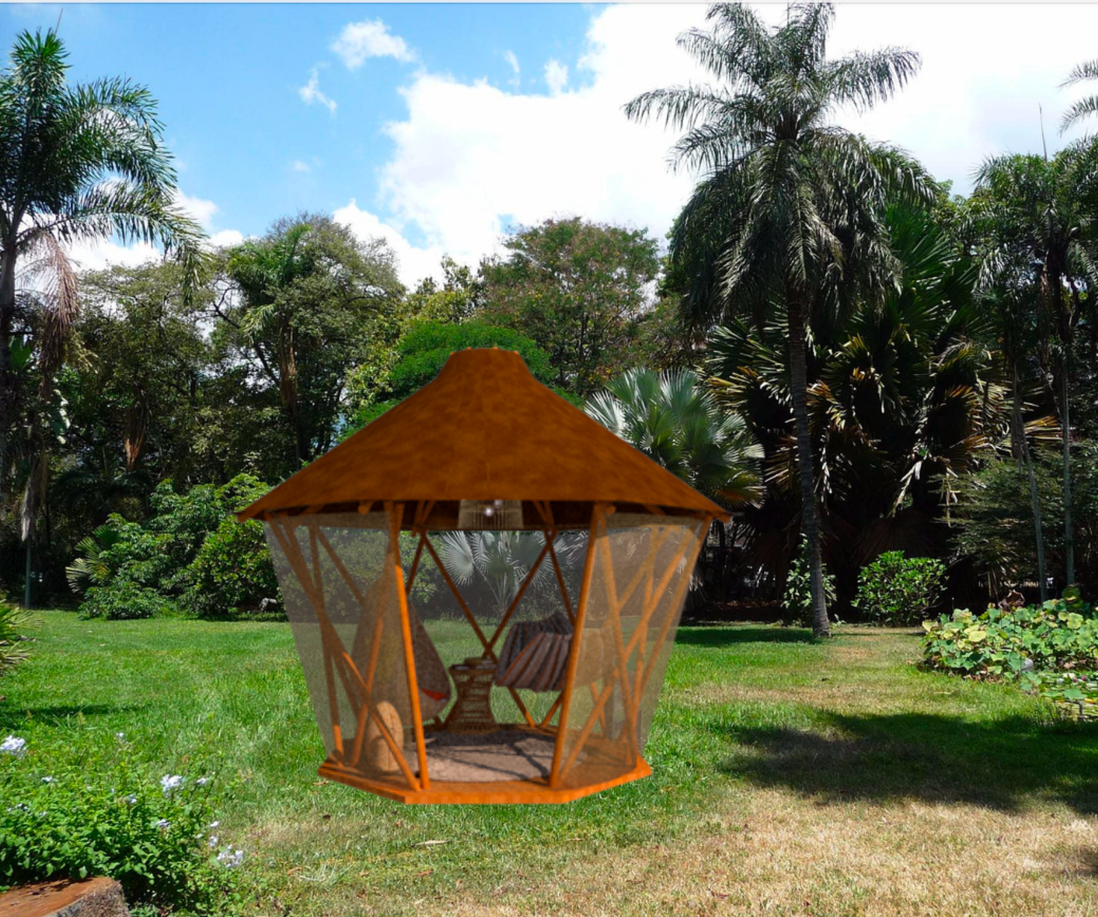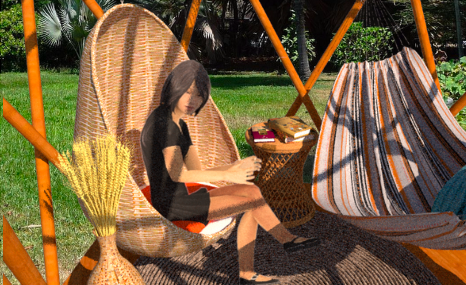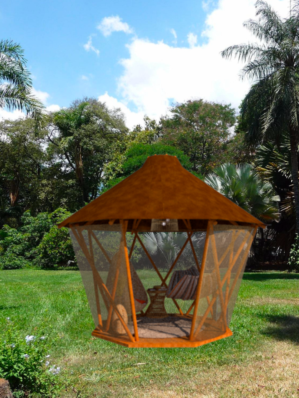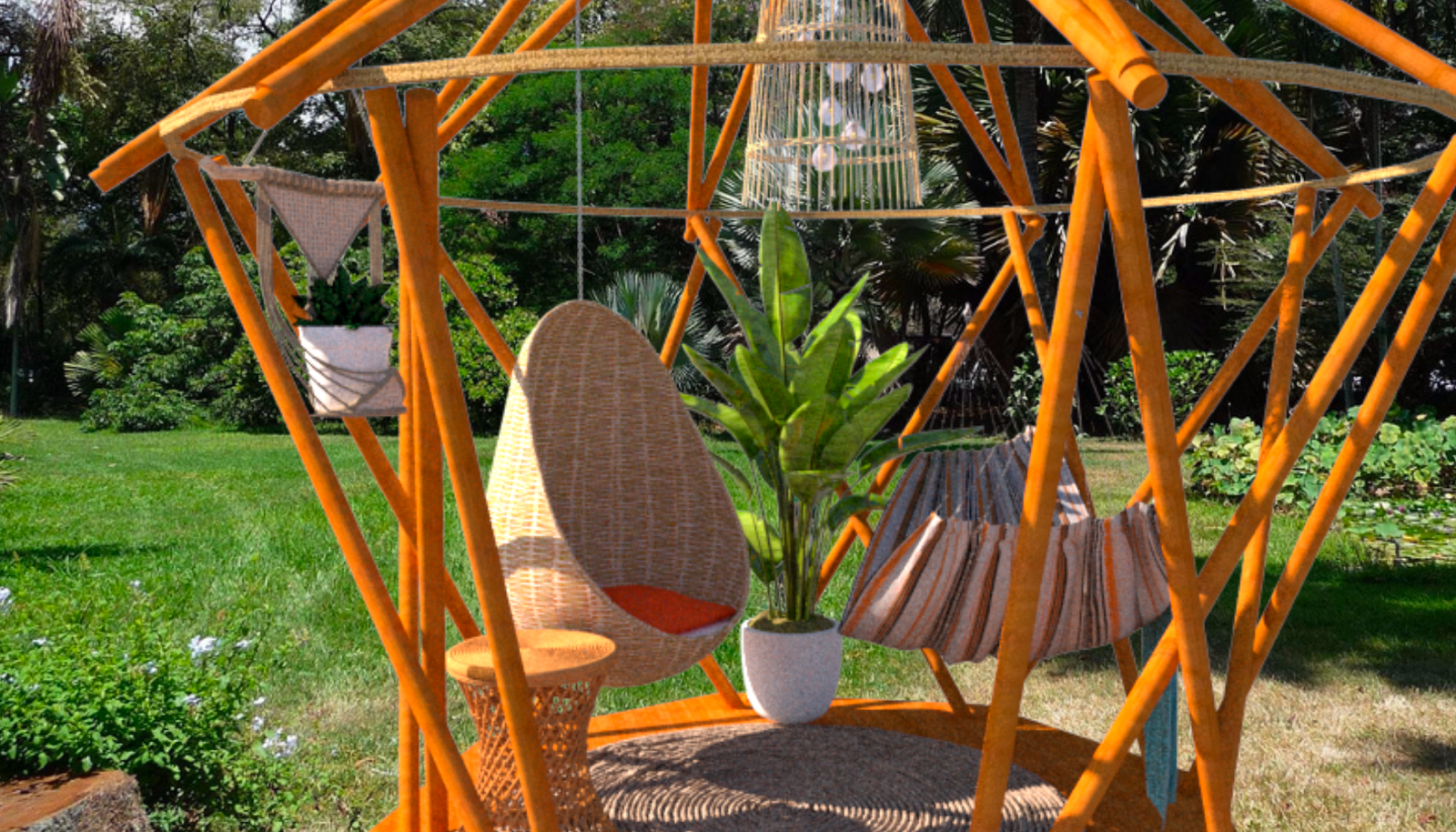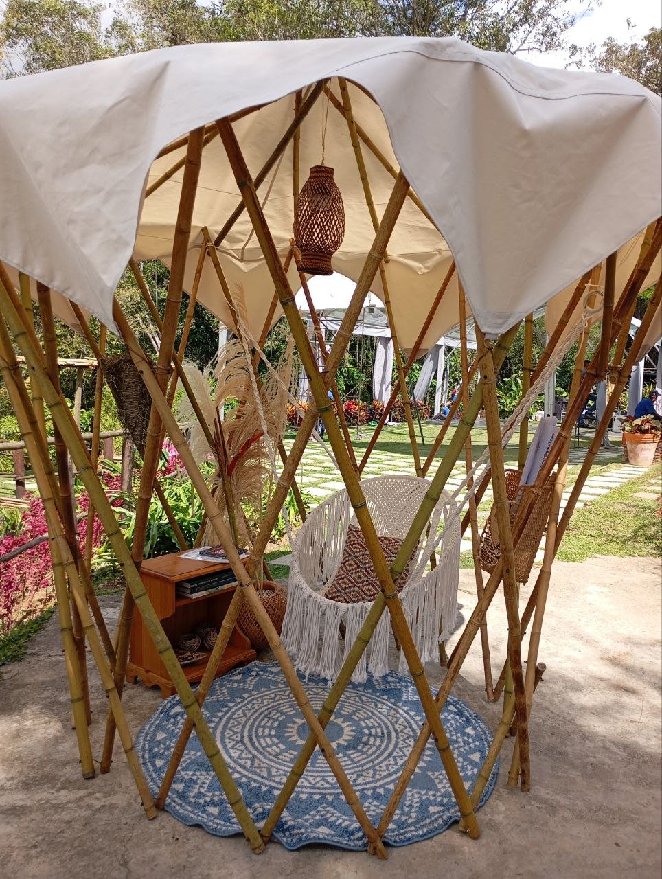 Cápsula de reposo concebida como una estructura portátil y desmontable, hecho con bambú de cosecha propia e ideal para crear un refugio agradable en diferentes contextos.