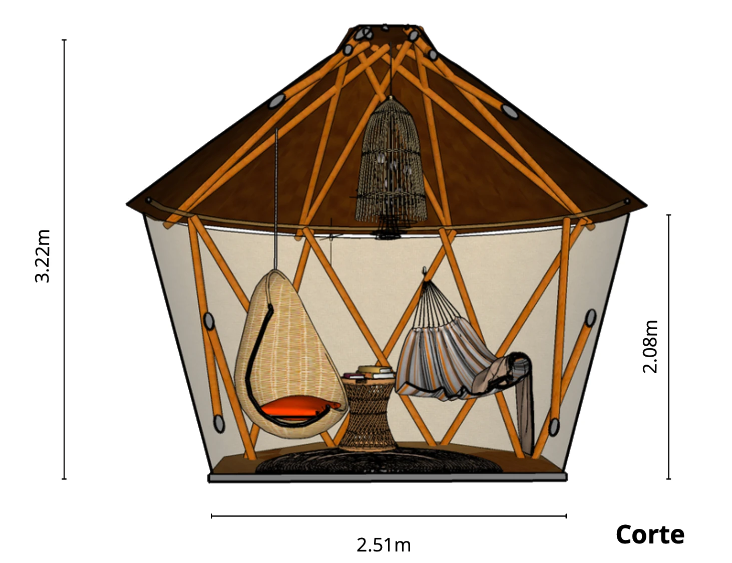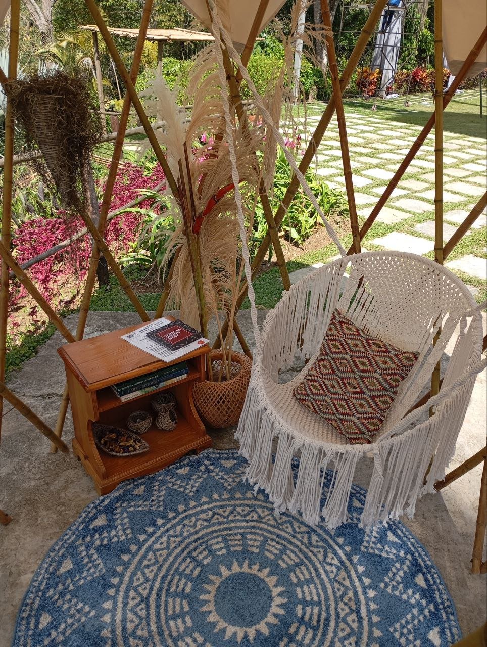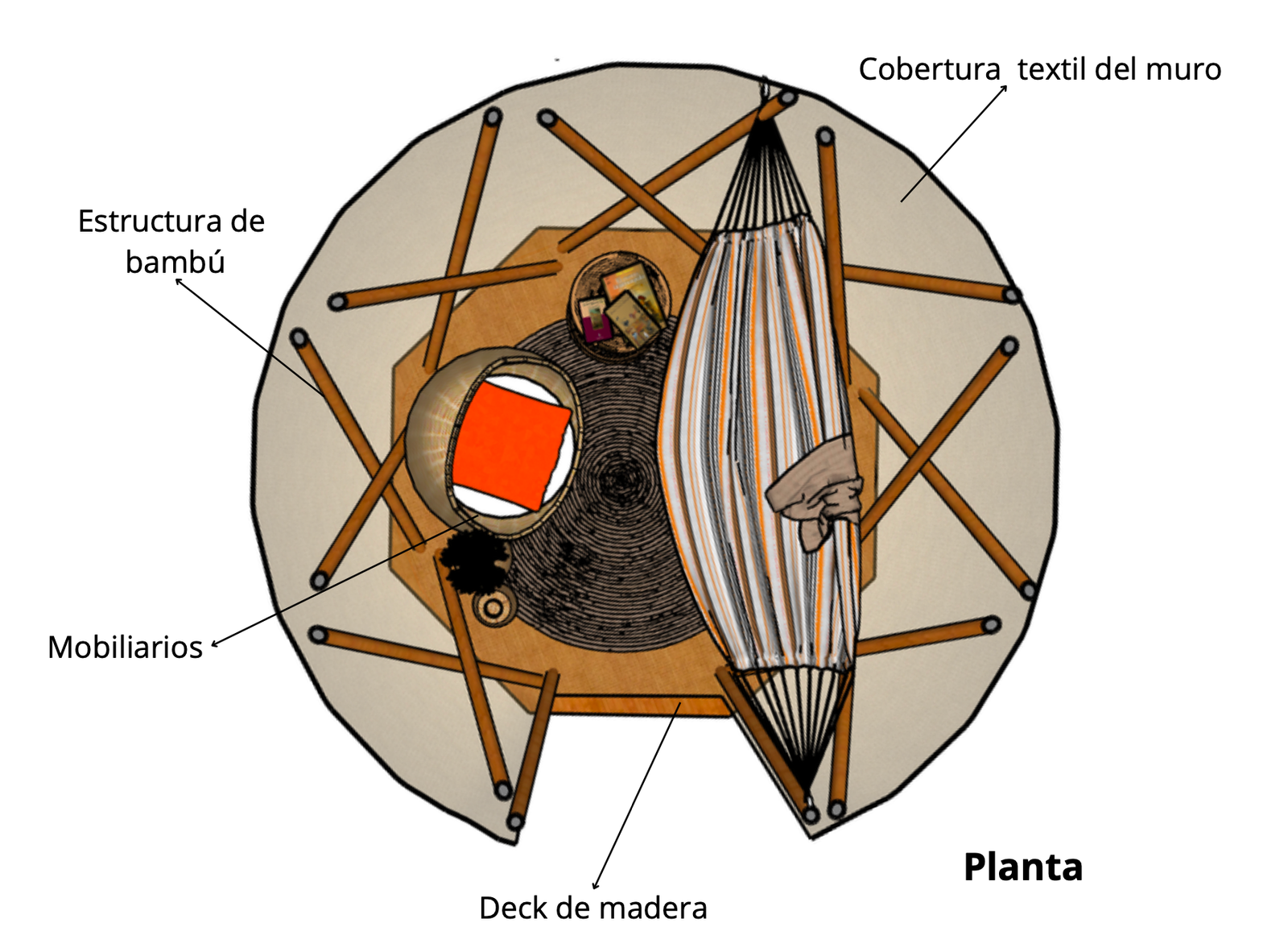 Nido combina un diseño estético con funcionalidad práctica. Su estructura incluye un deck de madera que complementa la textura natural del bambú, creando un ambiente cálido y acogedor. La cobertura textil del muro añade un toque de privacidad y protección, haciendo de esta estructura un espacio personal de esparcimiento y escape.